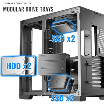 Modular drive trays supporting up to 6 drives: 2 x 3.5″ HDD & 4 x 2.5″ SSD.